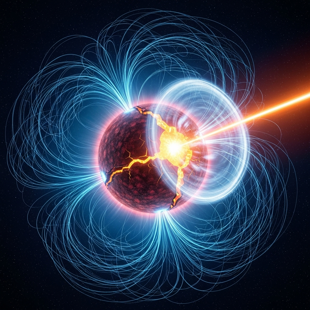 - 지각의 균열과 자기 재연결: 지각이 찢어지고 균열이 생기면서, 꼬여 있던 내부 자기장이 외부로 폭발적으로 재배열됩니다. 이 '자기 재연결' 과정에서, 불과 수 밀리초 만에 엄청난 양의 자기 에너지가 감마선과 X선 형태의 고에너지 복사로 전환됩니다.
