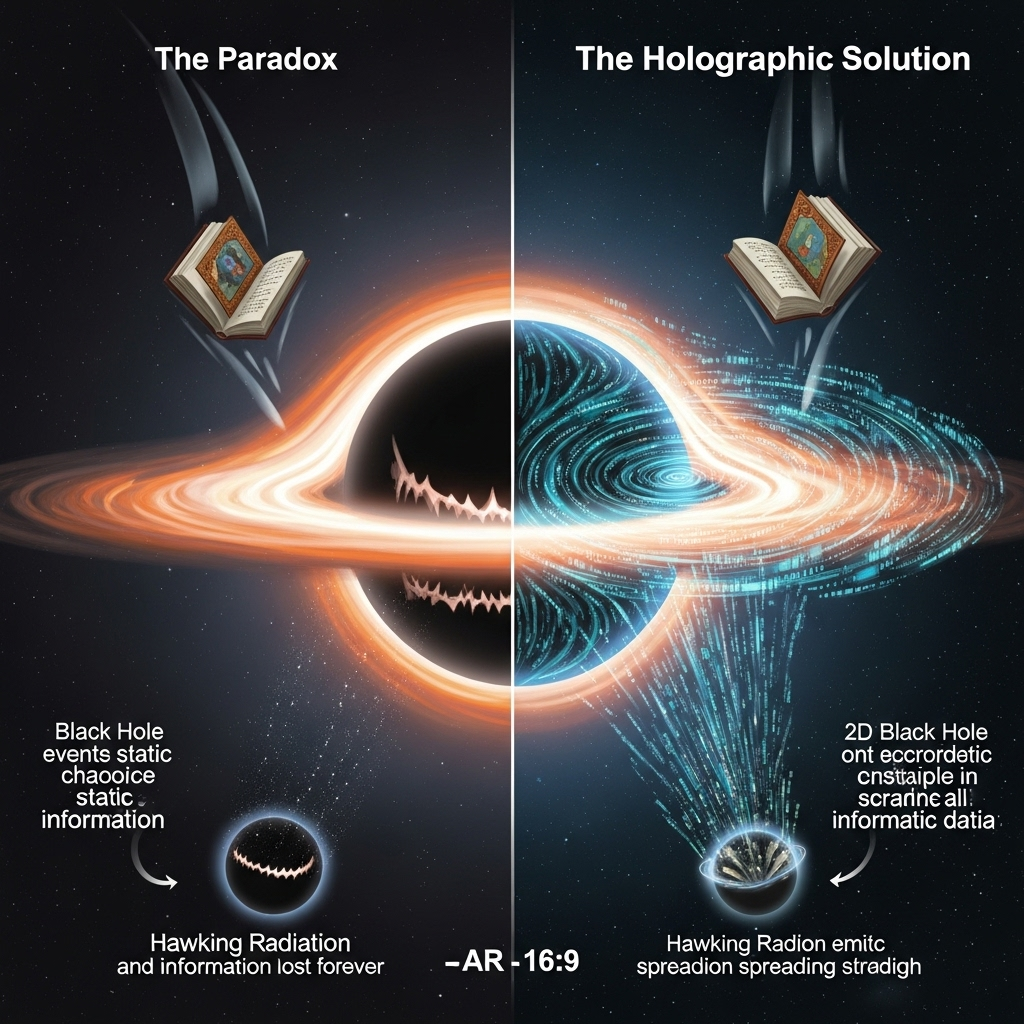 - 홀로그래피 원리: 어떤 부피 안에 담긴 모든 정보는 그 부피를 둘러싼 표면에 암호처럼 기록될 수 있다는 놀라운 아이디어입니다. 마치 3D 홀로그램 영상이 2D 필름에 기록되는 것과 같습니다. 블랙홀의 경우, 블랙홀 내부의 모든 3차원 정보는 그 경계면인 2차원 '사건의 지평선'에 완벽하게 인코딩되어 있다는 것입니다.