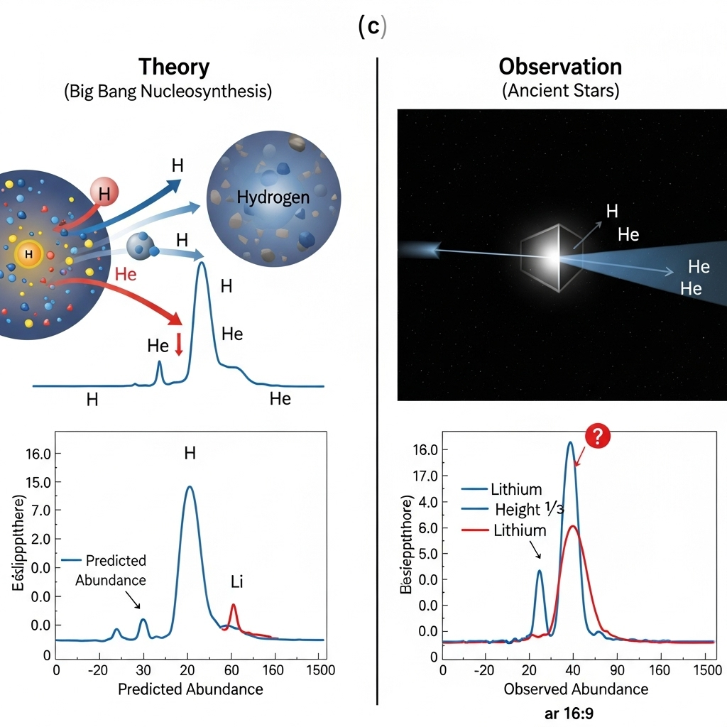 천문학자들은 이 늙은 별들의 대기에서 나오는 빛의 스펙트럼을 분석하여 리튬의 흡수선을 찾고, 이를 통해 리튬의 양을 측정합니다. 그런데 수많은 관측 결과, 이 별들의 리튬 양은 BBN 이론의 예측값보다 일관되게 약 3분의 1 수준에 불과한 것으로 나타났습니다. 이 별들의 리튬 양은 특정 값(스피트 고원, Spite plateau)에 평탄하게 분포하며, 예측치와의 간극은 좀처럼 좁혀지지 않았습니다. 이것이 바로 '빅뱅 리튬 문제'입니다.
