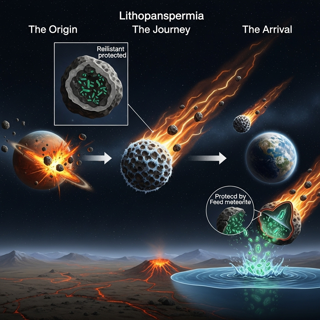 - 리소판스페르미아 (Lithopanspermia, 암석 판스페르미아): 가장 널리 논의되는 형태로, 소행성이나 혜성의 충돌로 인해 행성에서 떨어져 나온 암석 파편 속에 미생물이 보호된 채로 항성계 사이를 여행한다는 가설입니다. 암석은 우주의 강력한 방사선과 극저온으로부터 미생물을 보호하는 완벽한 '우주선' 역할을 합니다.